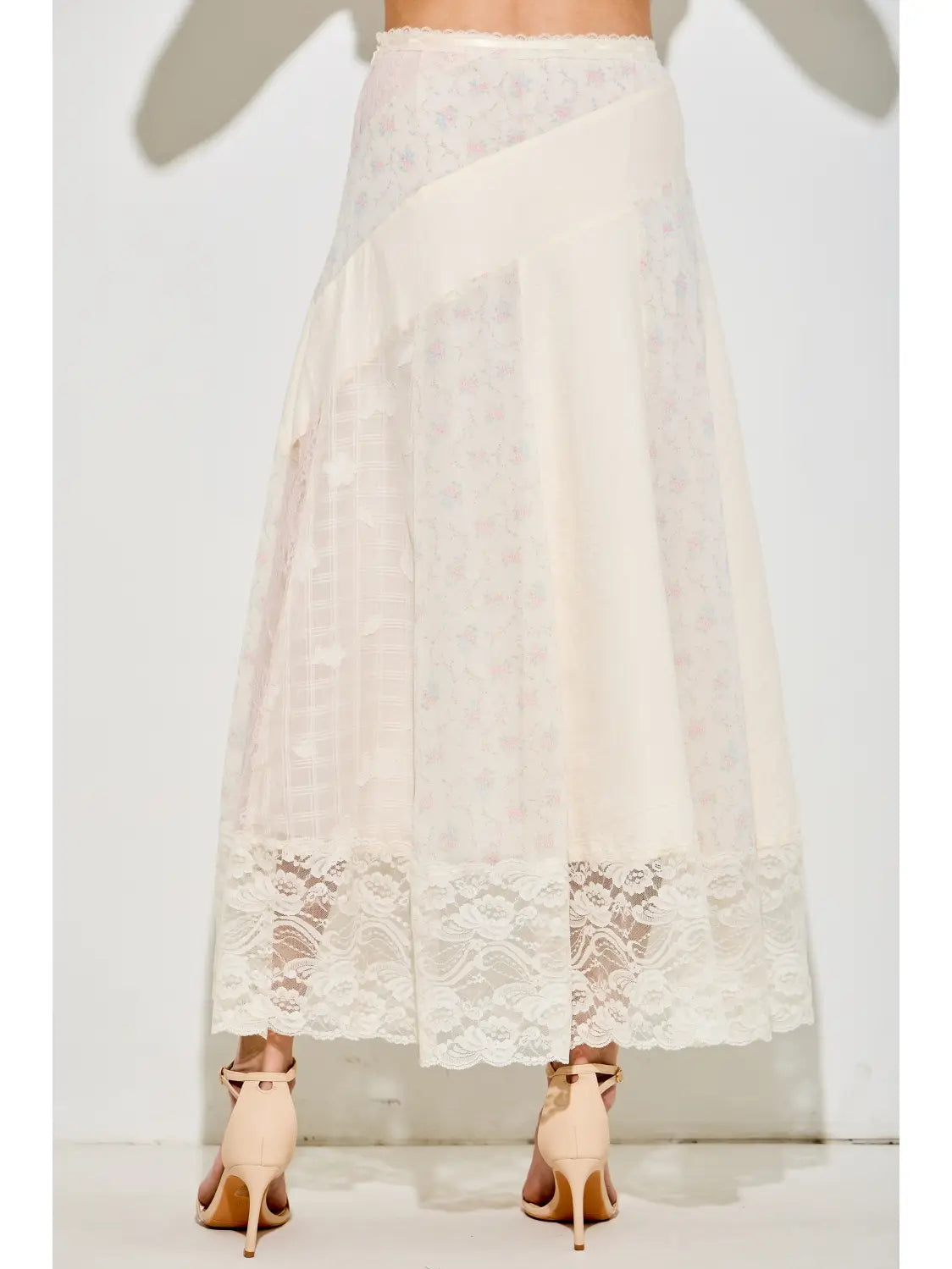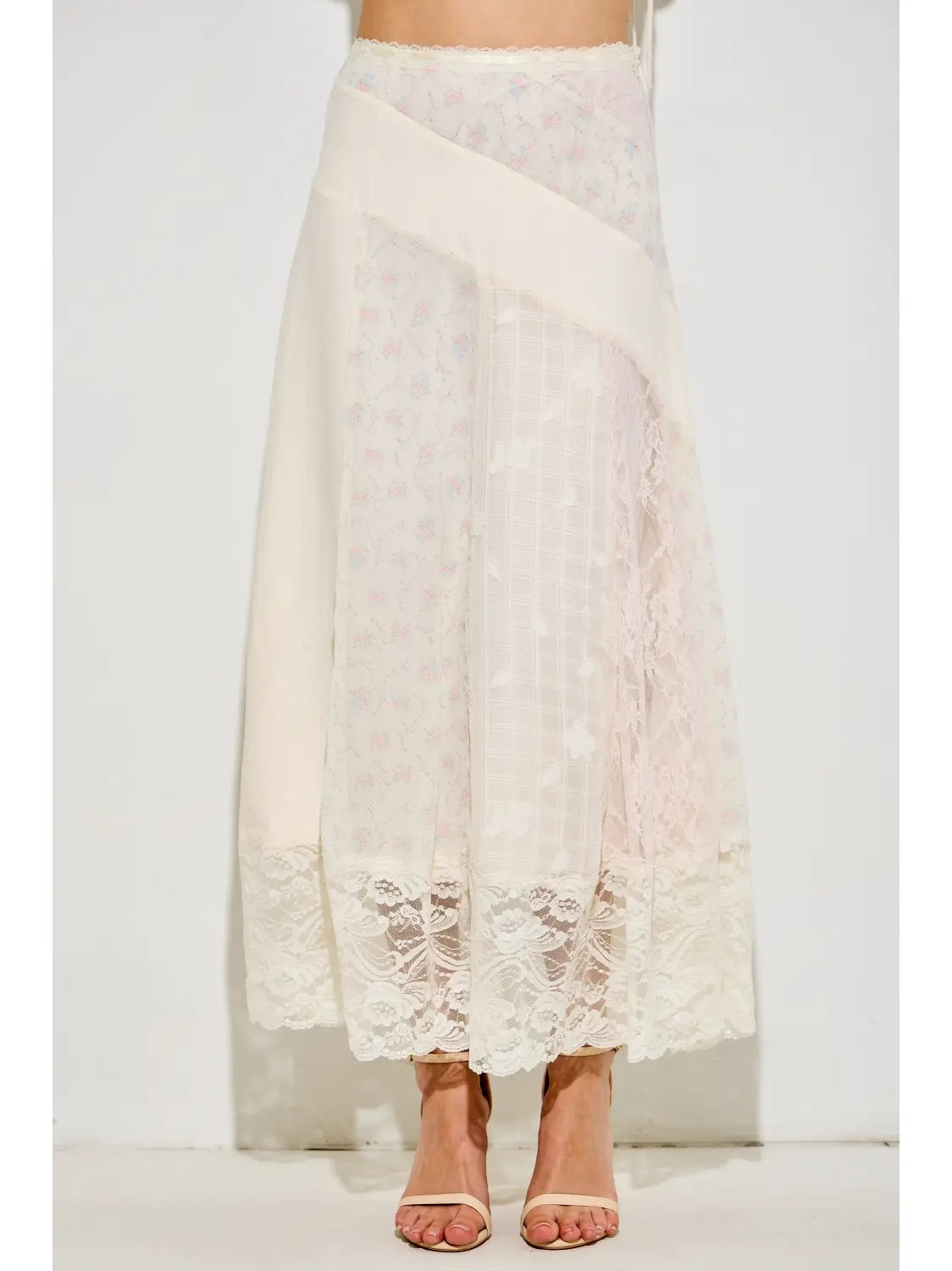 Capture a dreamy, bohemian aesthetic with this stunning mixed-media maxi skirt. Featuring a unique patchwork design of delicate floral prints, textured tonal panels, and romantic lace overlays, it is finished with a striking scalloped lace hem. This airy, ethereal piece offers timeless feminine charm for any season. - Scalloped Hem - Floral Print - Boho Chic - A-Line Silhouette - Textured Fabric