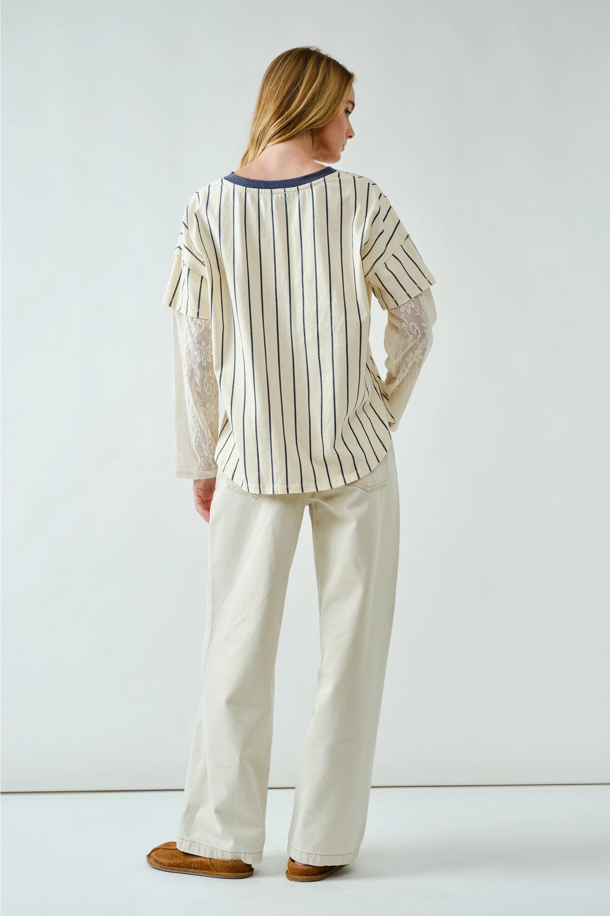 This oversized tee inspired by vintage baseball jerseys. Featuring bold contrast pinstripes, a sporty “88” graphic, and “LOS ANGELES” lettering across the front, The unexpected lace sleeve inserts and hem detail add a feminine twist to the classic athletic silhouette.