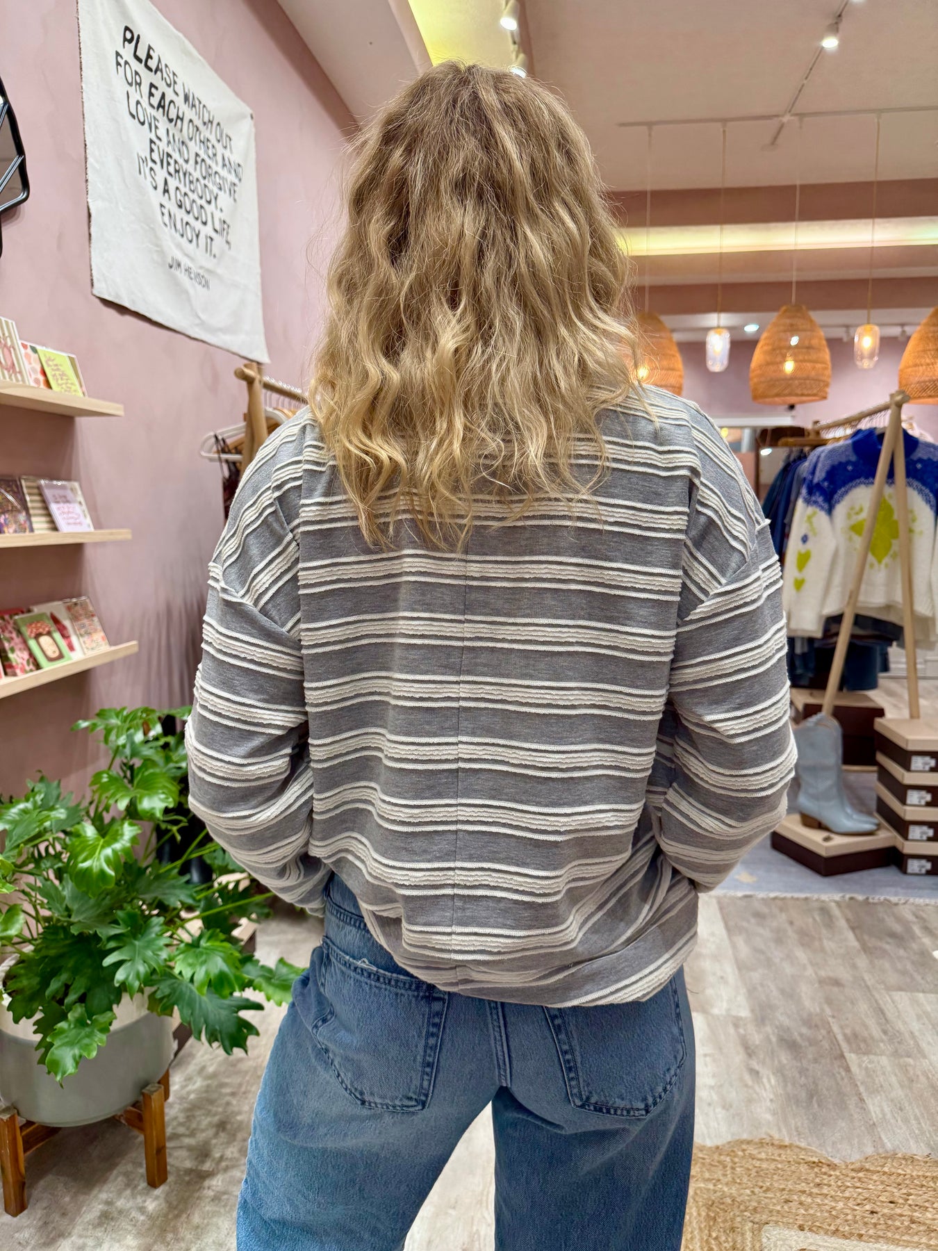 Long sleeve top featuring delicate lace detailing and grey-ivory stripes for an effortless, layered look.