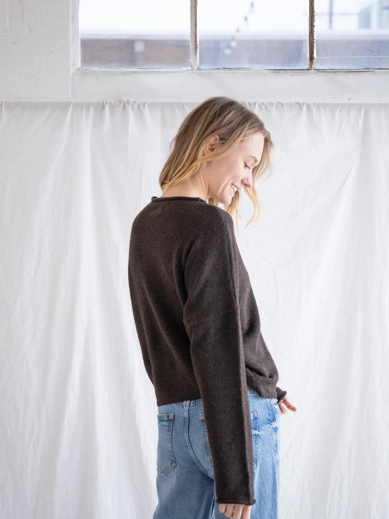 Soft and cozy lightweight cardigan with rolled edge finish on the sleeves and collar.