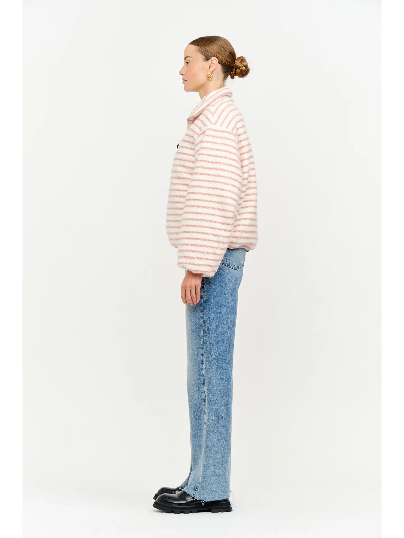 A cozy layer with a playful twist, this blush striped jacket brings softness and charm to your everyday style. Designed with a plush feel and easy zip closure, it’s the perfect blend of comfort and feminine flair.
