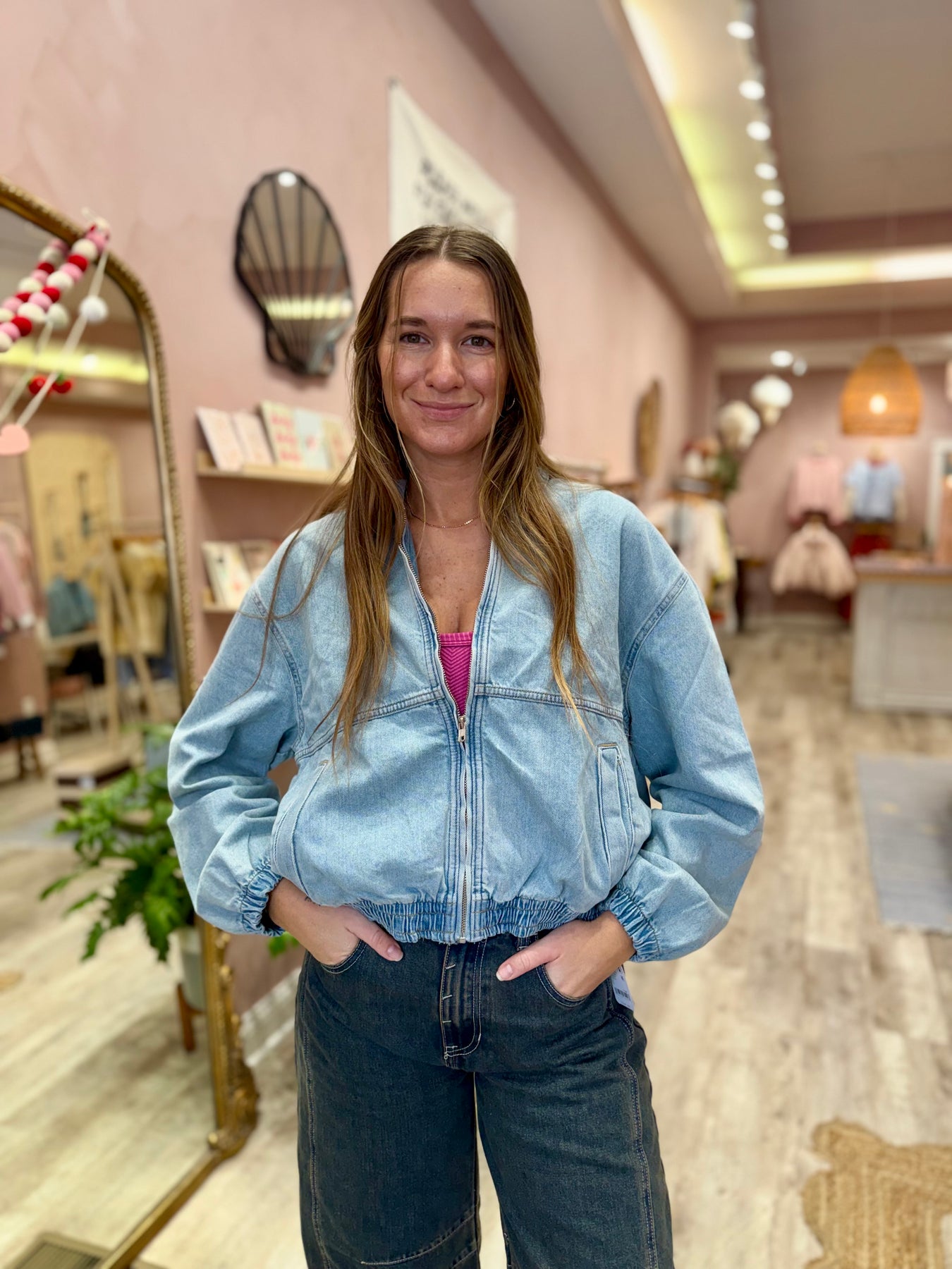 The perfect throw-on-the-go design, this denim jacket from our We The Free collection features a lightweight cotton fabrication, a classic bomber silhouette, and a collared neckline for a timeless touch.
