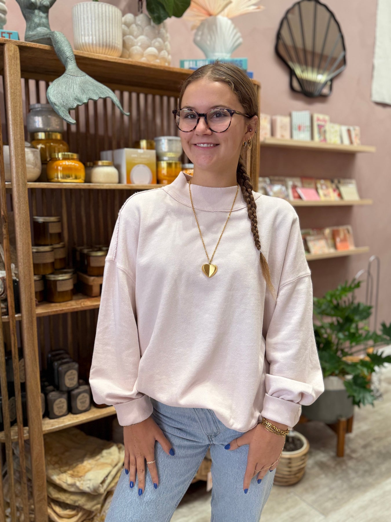 Features: French terry fabrication, mock neckline, drop-shoulder long sleeves, ribbed trim, exposed seams