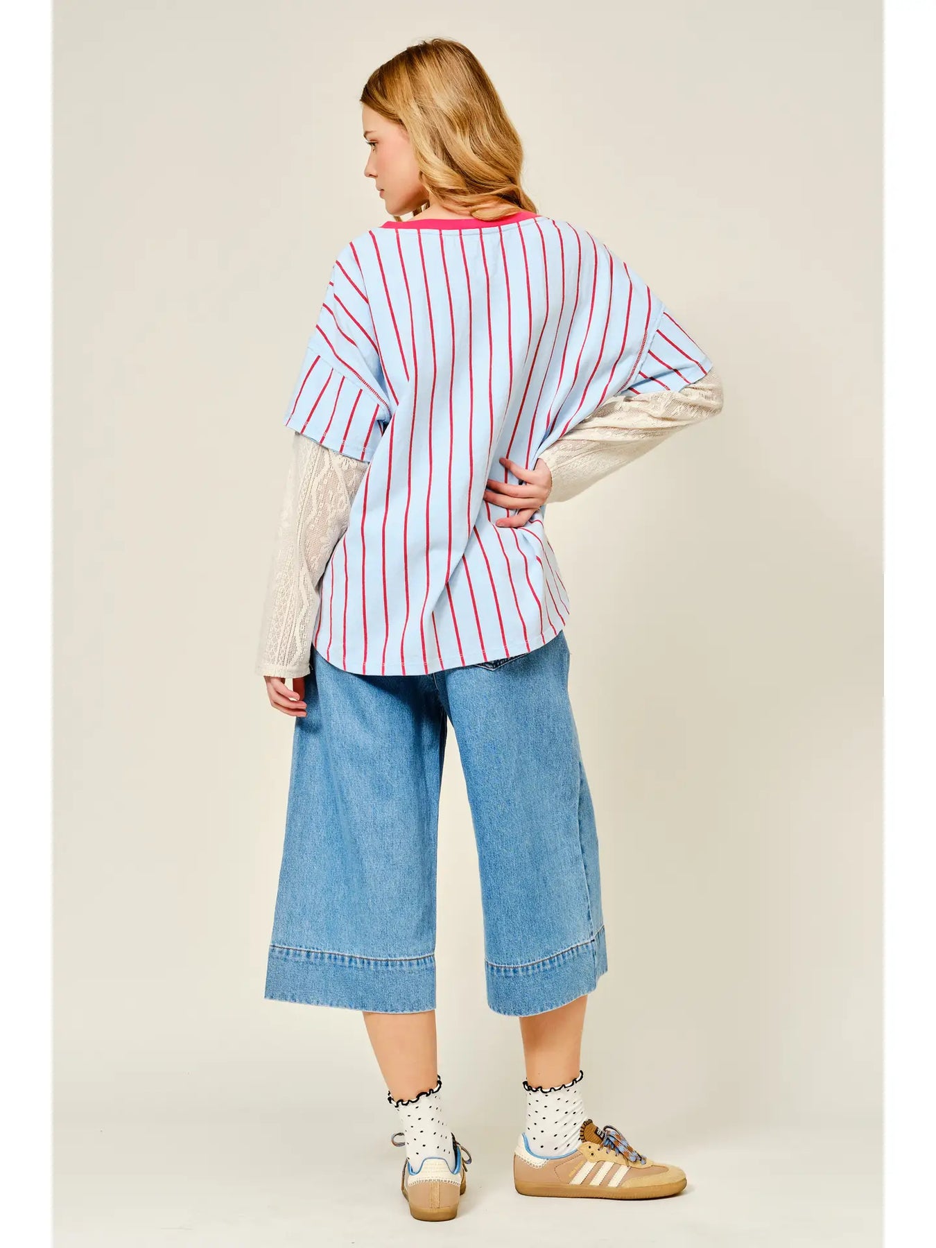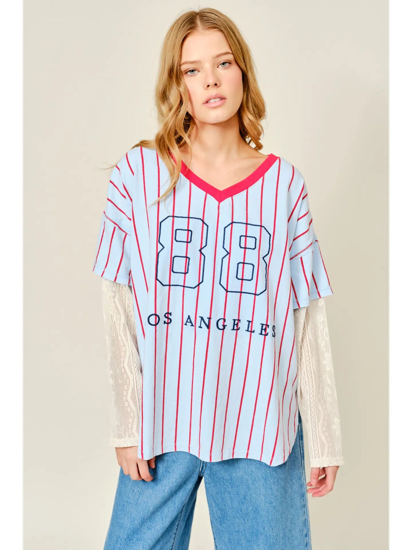 This oversized tee inspired by vintage baseball jerseys. Featuring bold contrast pinstripes, a sporty “88” graphic, and “LOS ANGELES” lettering across the front, The unexpected lace sleeve inserts and hem detail add a feminine twist to the classic athletic silhouette.
