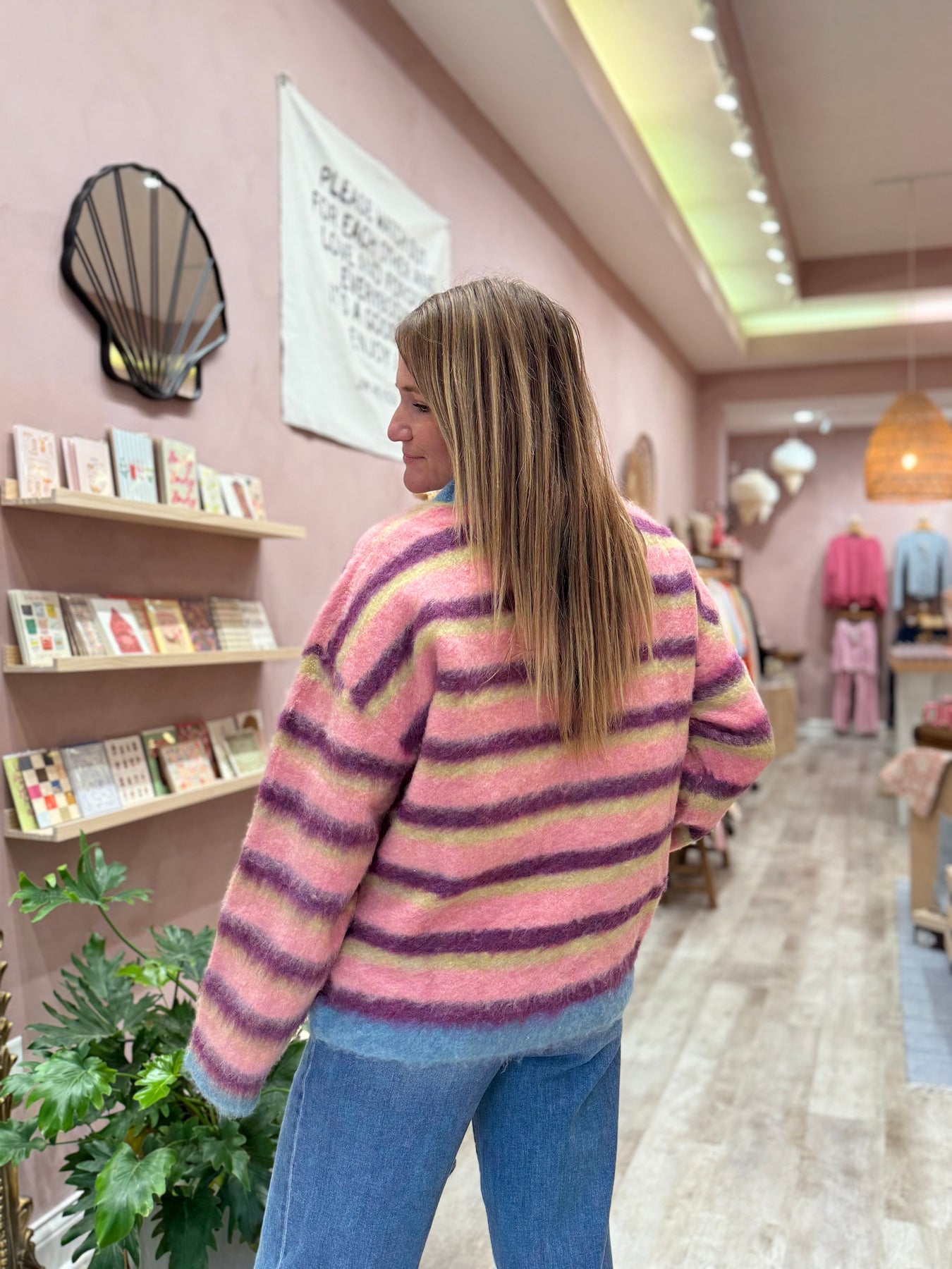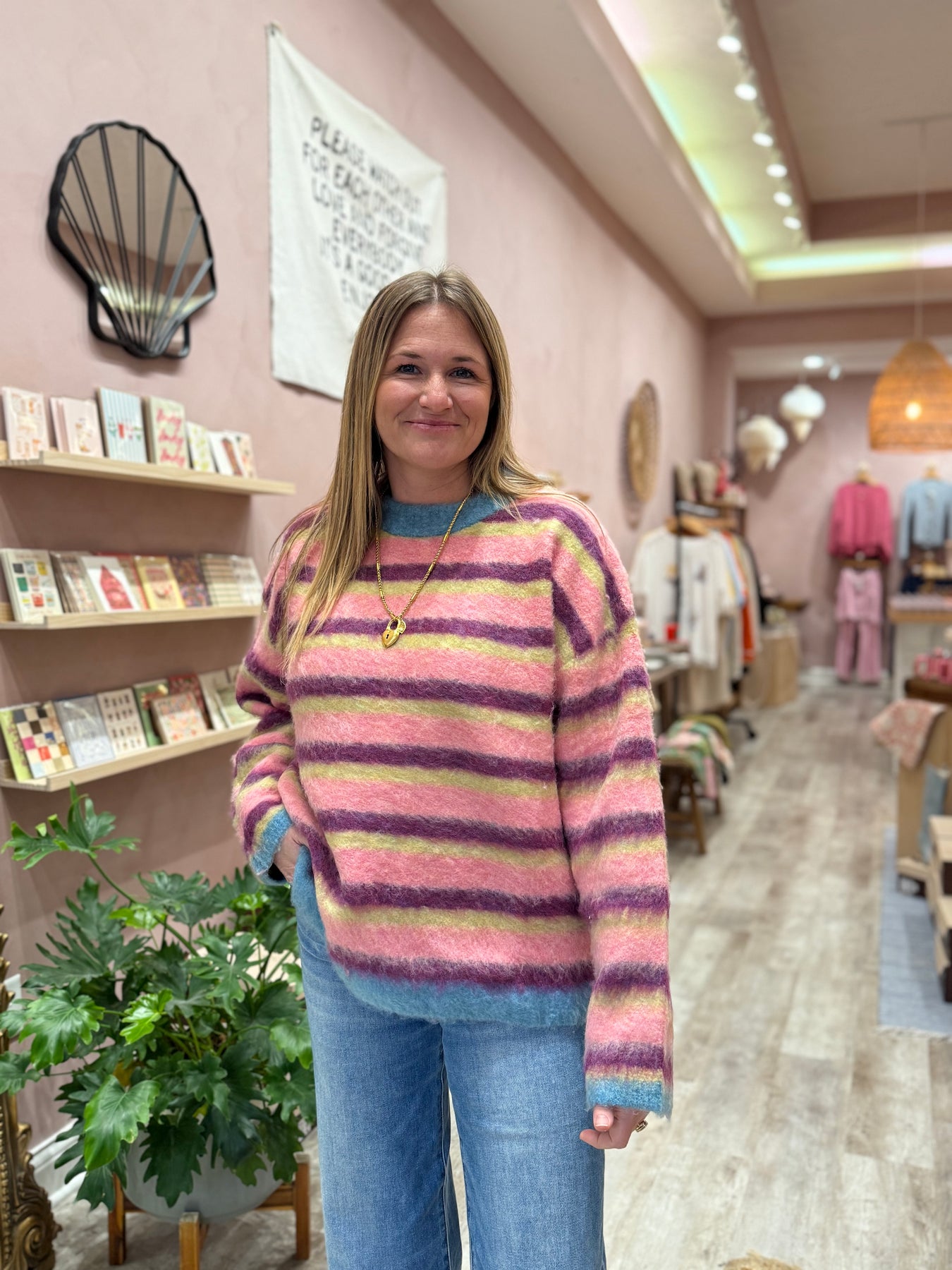 A cozy layering piece featuring a soft brushed texture in a striking blend of colors. This versatile sweater top works beautifully on its own!