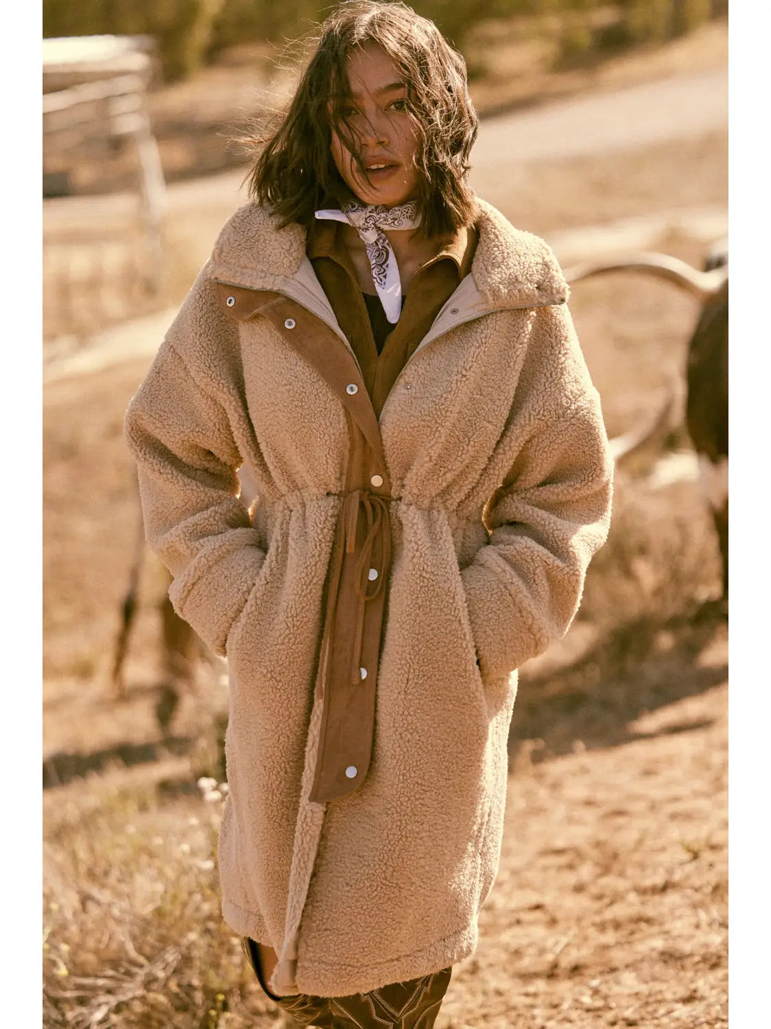 This cozy faux shearling piece features a commanding high collar and convenient zip-up front, complemented by a snap-button placket in soft faux suede. The drawstring waist with matching tie lets you customize your silhouette, while functional side pockets keep essentials within reach. Long sleeves with relaxed drop shoulders create an easy, flattering fit that works with everything in your wardrobe. Knee-length cut and full lining ensure warmth and durability season after season.