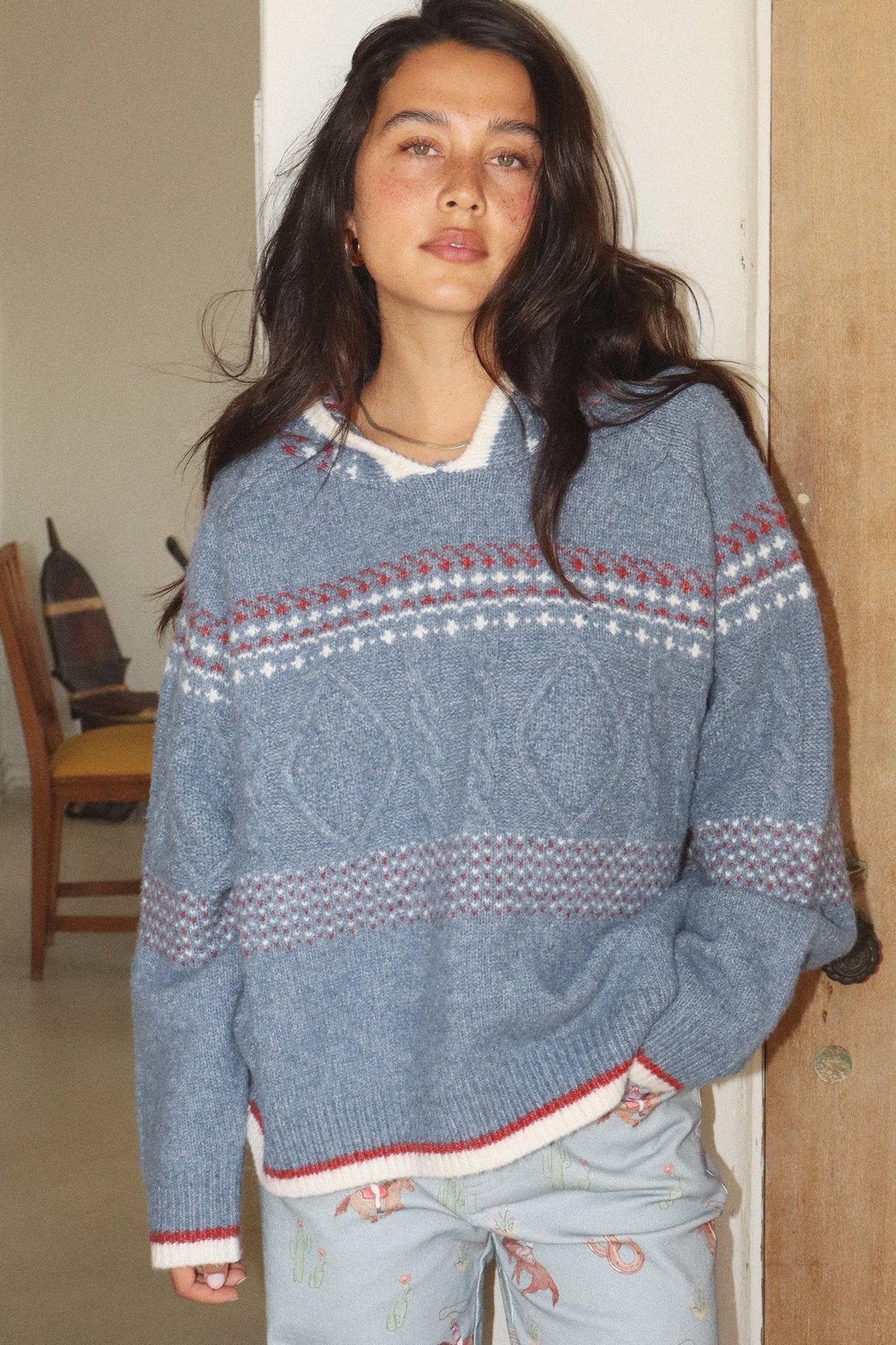 Embrace timeless style with this navy Fair Isle hooded sweater, crafted with a vintage-inspired knit for cozy warmth and classic charm.